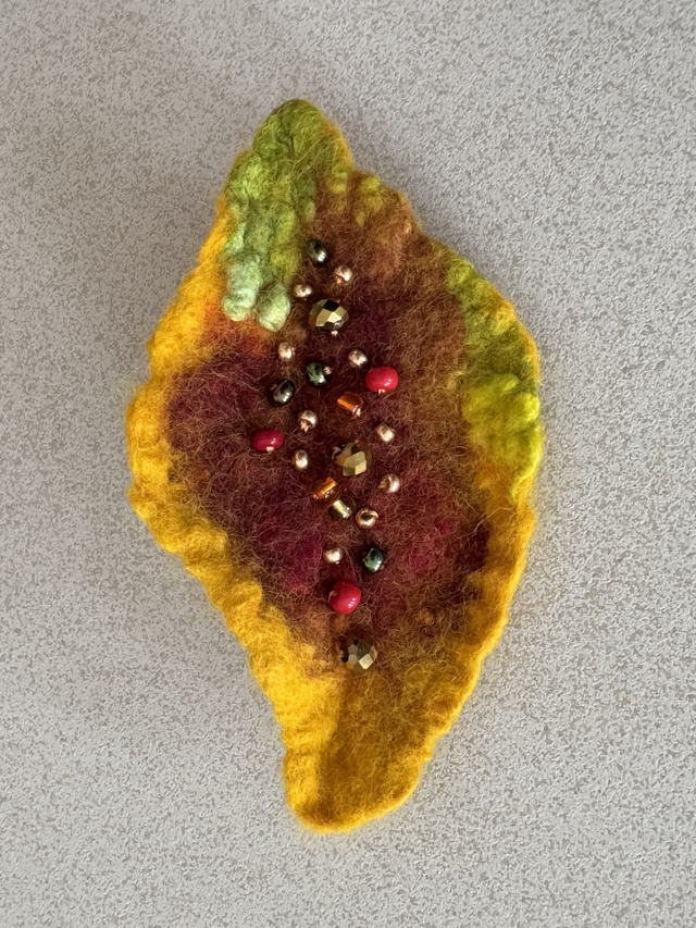 Ein kleines Stück Herbst zum Anstecken: Diese handgefilzte Brosche in Blattform bringt dein Outfit zum Leuchten – auch an grauen Tagen.
