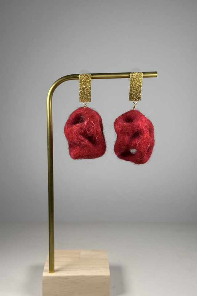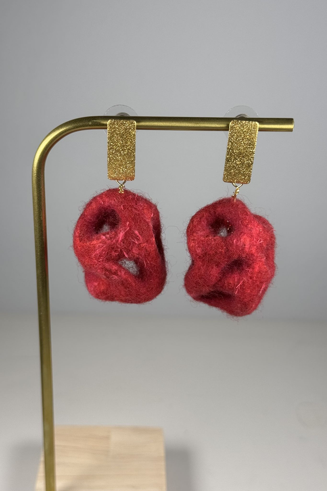 Diese handgefertigten Ohrringe vereinen sinnliche Farbe und lebendige Struktur. Aus feiner Wolle gearbeitet und mit zarten Federn eingefilzt, entstehen kleine textile Skulpturen - leicht, luftig und doch kraftvoll. Die goldfarbenen Edelstahlstecker mit strukturierter Oberfläche fügen einen edlen Glanz hinzu und runden das außergewöhnliche Design perfekt ab.