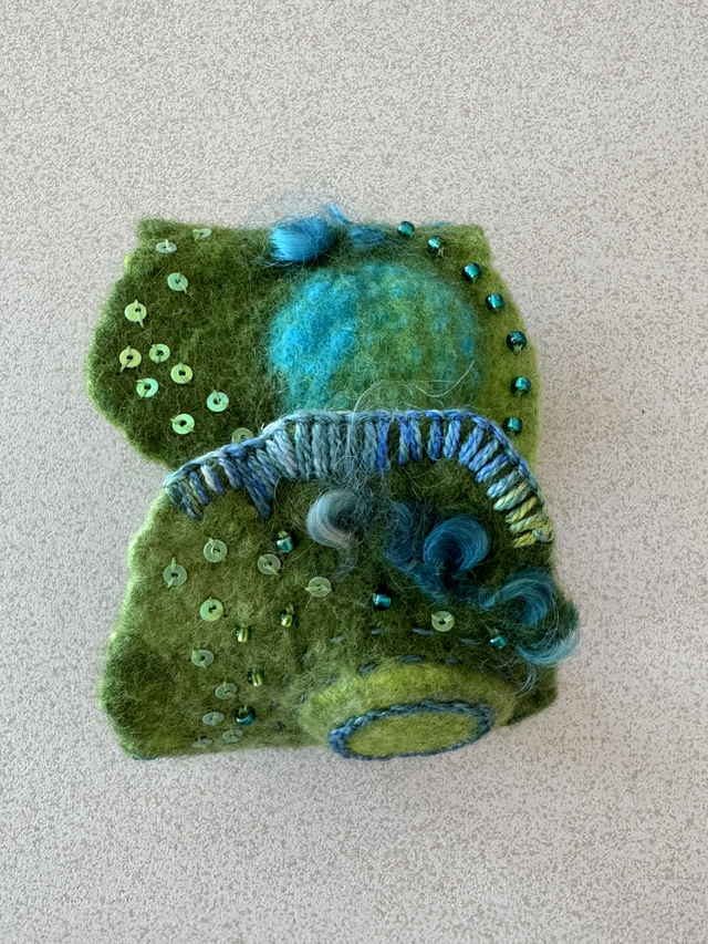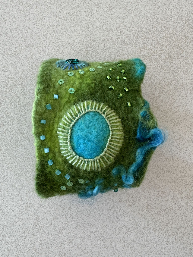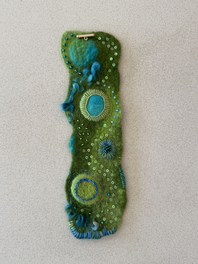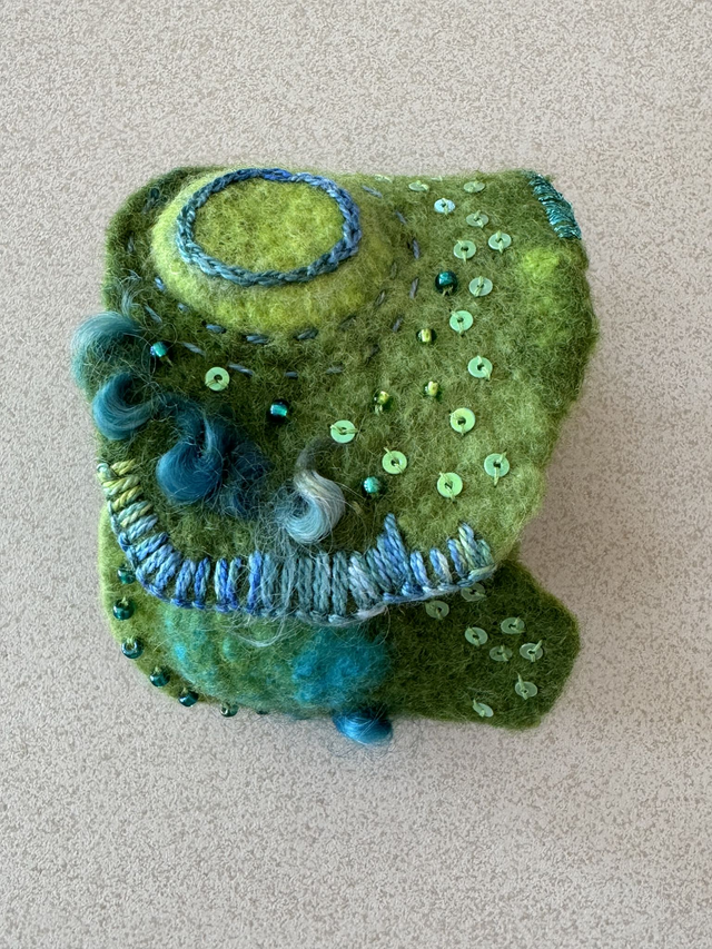 Gefilzt aus feiner Merinowolle in Grün- und Türkistönen, mit eingefilzten Wolllocken und aufwendiger Stickerei versehen. Jede Perle, jede Paillette ist doppelt von Hand angenäht. Das verwendete Garn besteht aus Baumwolle, Seide (z. T. handgefärbt) und Metallicgarn.