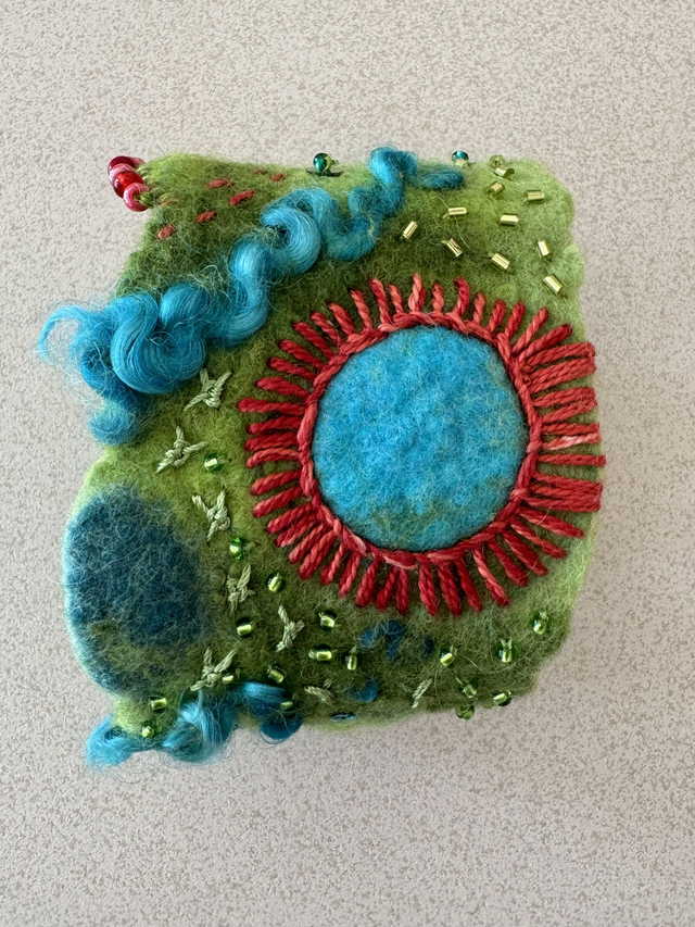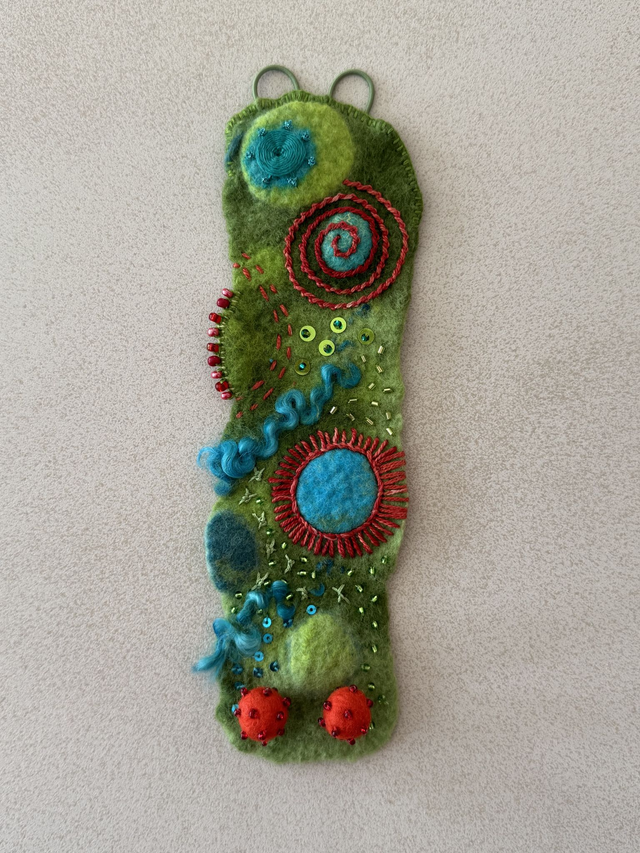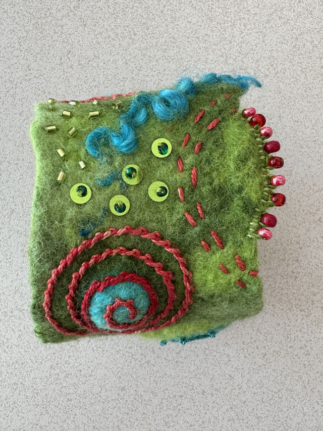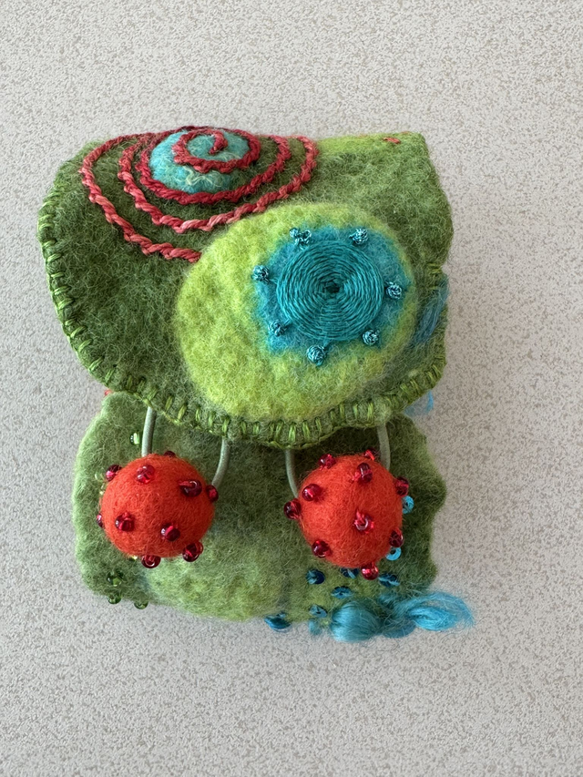 Gefilzt aus feiner Merinowolle in Grün- und Türkistönen, mit eingefilzten Wolllocken und aufwendiger Stickerei versehen. Jede Perle, jede Paillette ist doppelt von Hand angenäht. Das verwendete Garn besteht aus Baumwolle und Seide (z. T. handgefärbt).
