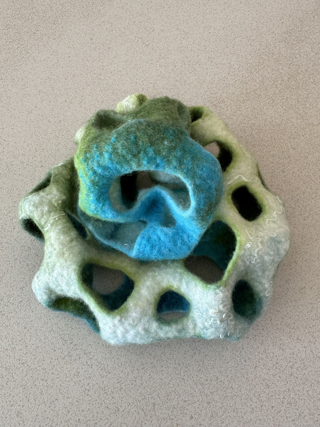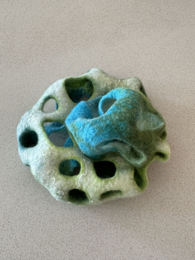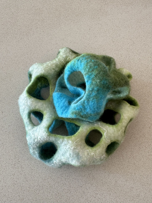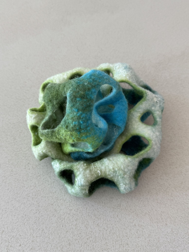 Handgefilzt aus feinster Merinowolle mit eingefilzten Viskosefasern, in leuchtenden Farben zwischen Türkis, Grün und Naturweiß. Durch ihre plastische Form und den offenen, skulpturalen Aufbau erinnert sie an Korallen, Pflanzen oder textile Kunstobjekte.