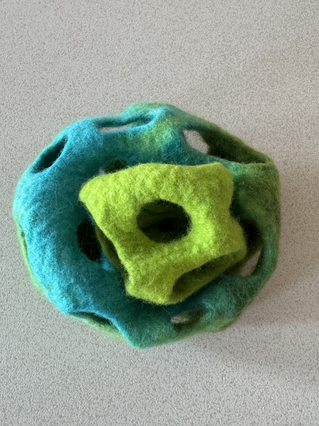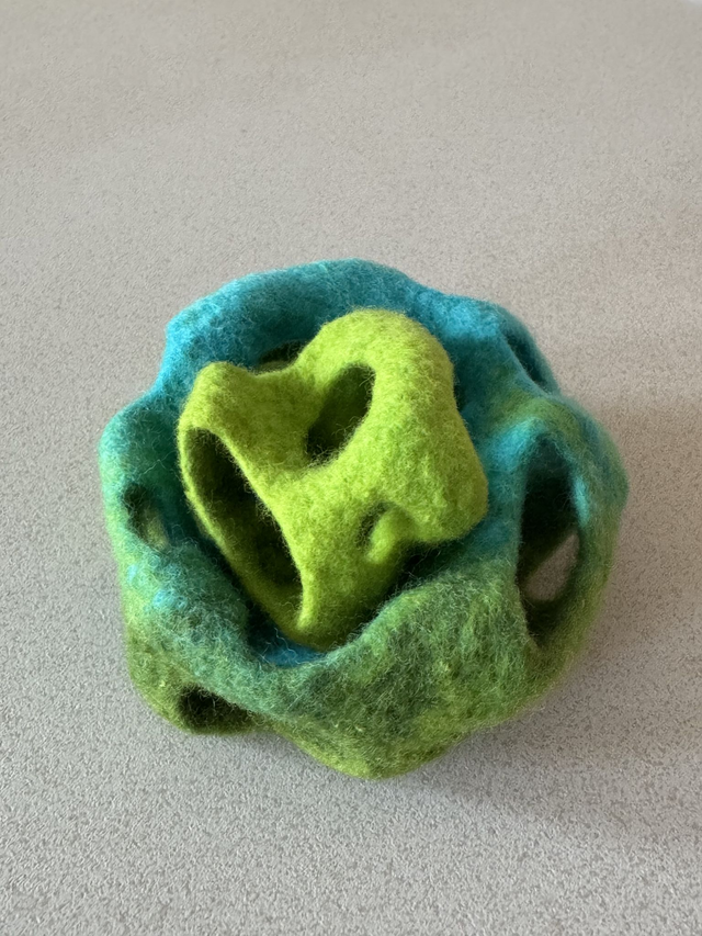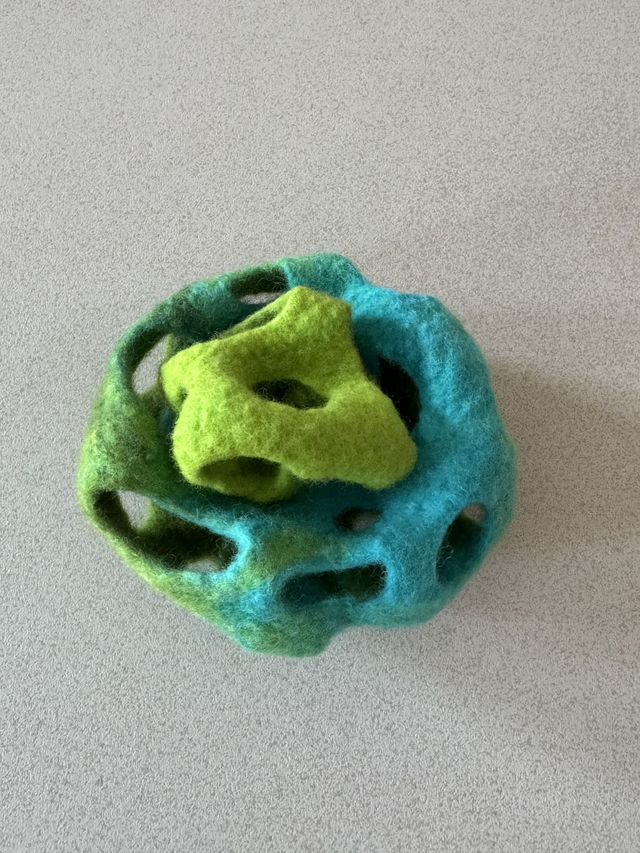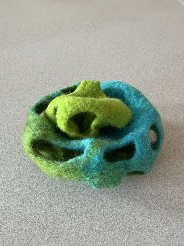 Diese handgefilzte Brosche in intensiven Grüntönen und kräftigem Türkis ist ein ausdrucksstarkes Einzelstück – plastisch gearbeitet und lebendig in der Form. Aus 100 % feiner Merinowolle gefertigt, erinnert ihre organische Struktur an eine natürliche Wuchsform – frei gestaltet, leicht und dennoch stabil. Die Brosche misst ca. 11 cm im Durchmesser und ist ca. 5 cm hoch – damit ist sie deutlich präsent, aber wunderbar tragbar. Befestigt wird sie über eine silberfarbene, runde Broschennadel auf der Rückseite. Ob am Lieblingspulli, auf einem Mantel, Schal oder Hut – diese Brosche ist ein treuer Begleiter für die kühle Jahreszeit. Auch auf Taschen oder als kunstvolles Detail auf einer Jacke setzt sie besondere Akzente.