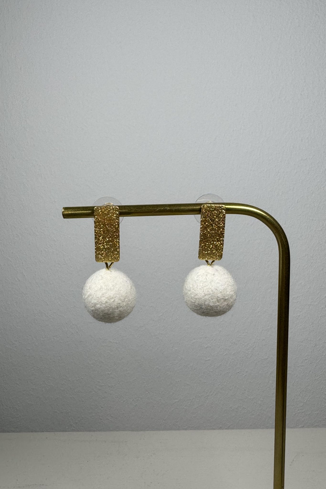 Schlichte Eleganz mit einem Hauch Glamour. Die sanft weißen Filzperlen aus feiner Wolle und Seide hängen an goldfarbenen Edelstahlsteckern mit edler Textur. Das Zusammenspiel von weichem Filz und glänzendem Metall macht sie zu einem besonderen Blickfang - modern, stilvoll und edel.