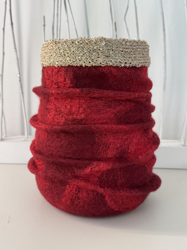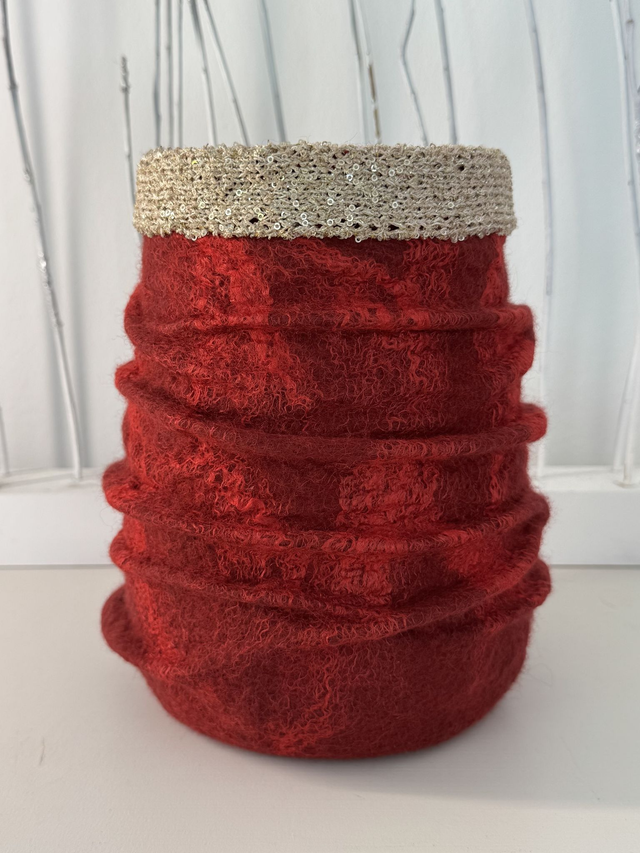 Der obere Abschluss – ein von Hand gestrickter Rand aus goldfarbenem Garn mit eingearbeiteten Pailletten – bildet einen funkelnden Kontrast zum tiefen Rot des Filzes. Edel, warm und strahlend zugleich.